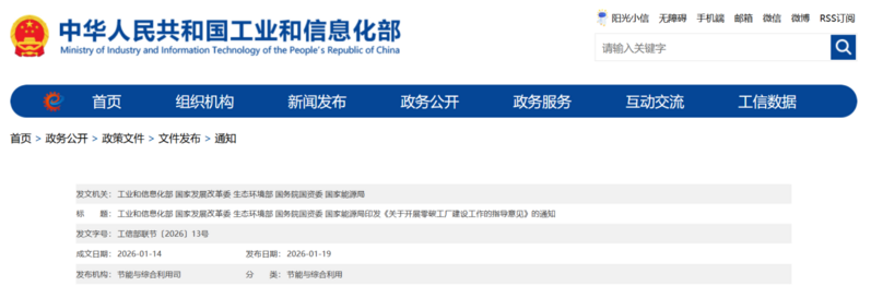 1月19日,工业和信息化部、国家发展改革委、生态环境部、国务院国资委、国家能源局等五部门联合印发《关于开展零碳工厂建设工作的指导意见》(工信部联节〔2026〕13号,以下简称《指导意见》),深挖工业和信息化领域节能降碳潜力,带动重点行业领域减碳增效和绿色低碳转型,培育发展新质生产力。
